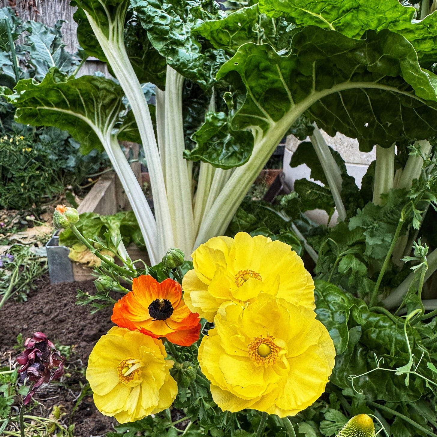 This is not a clumsy bouquet. Simply a shot of the garden. I put flowers in with the vegetables as you know. For the pollinators. These are ranuncula growing in beside the Silverbeet.