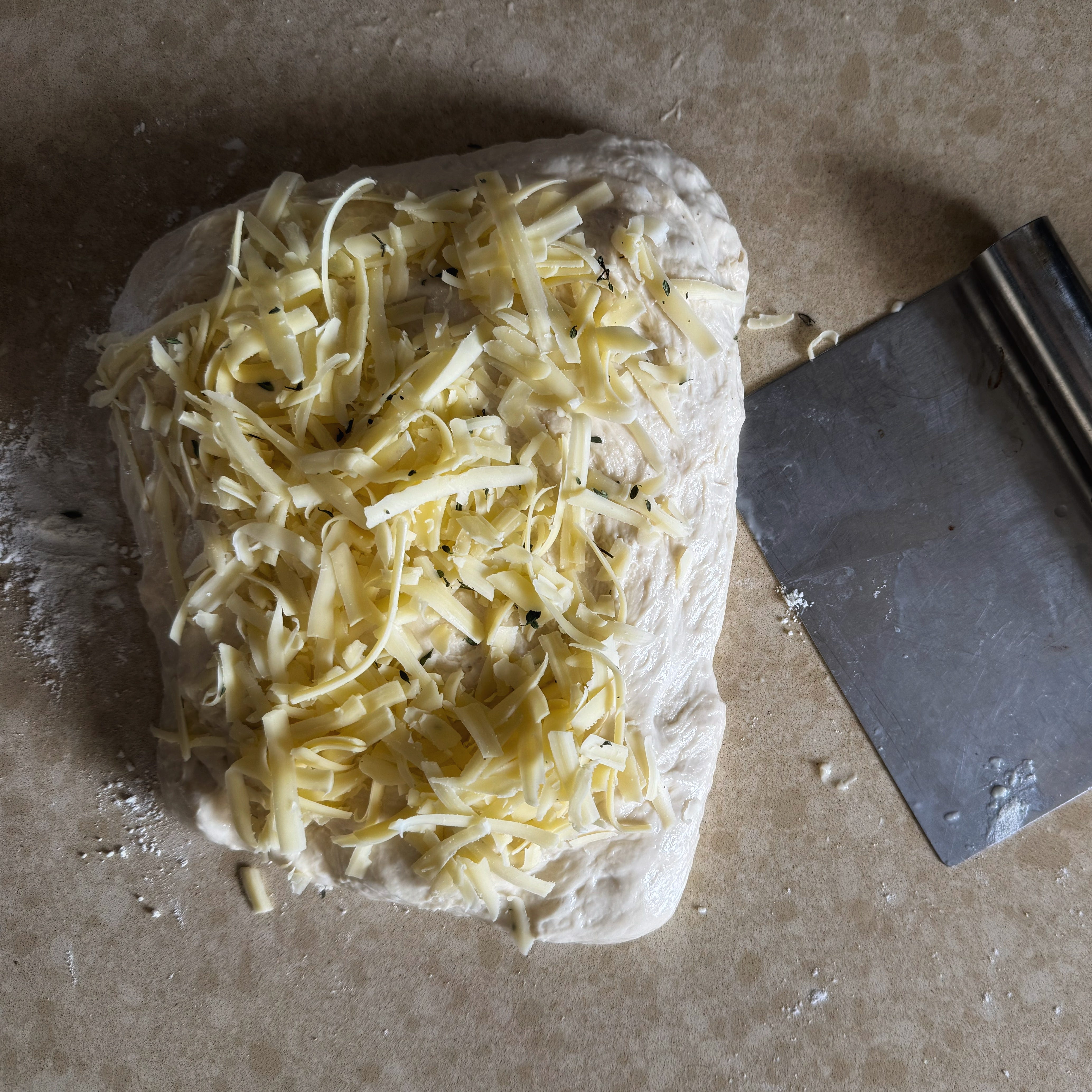 With any inclusions into my bread - like the cheese and thyme here - I add it into the last stretch and fold. So I rolled cheese and fresh thyme into the dough before shaping but maybe I should have incorporated the grated cheesy cheese a little earlier. In this loaf - we ended up with a big hole of melted cheese.