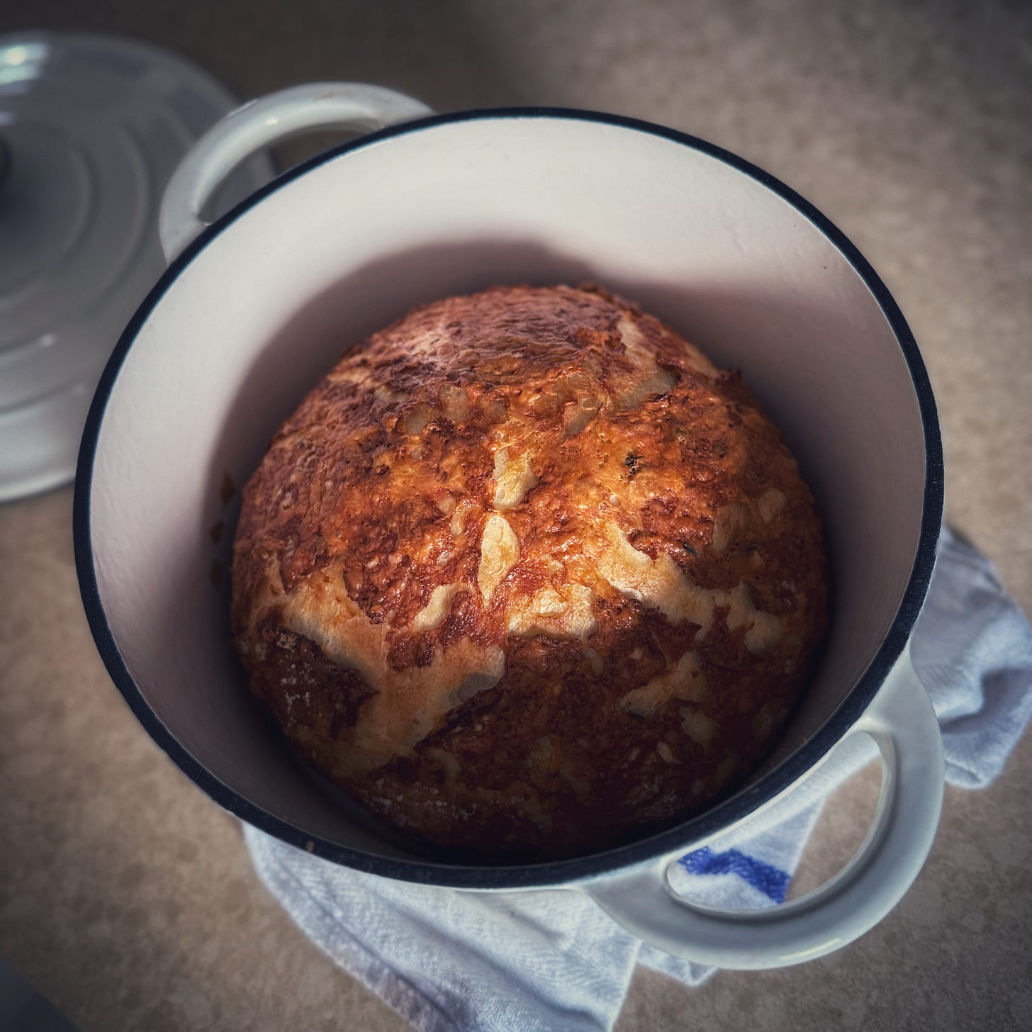 The cast iron pot was on a 50% sale and will last forever. I hate to buy new things - pre loved is so much better - but these pots last forever. And this is just the right size for the loaf I like the most.
