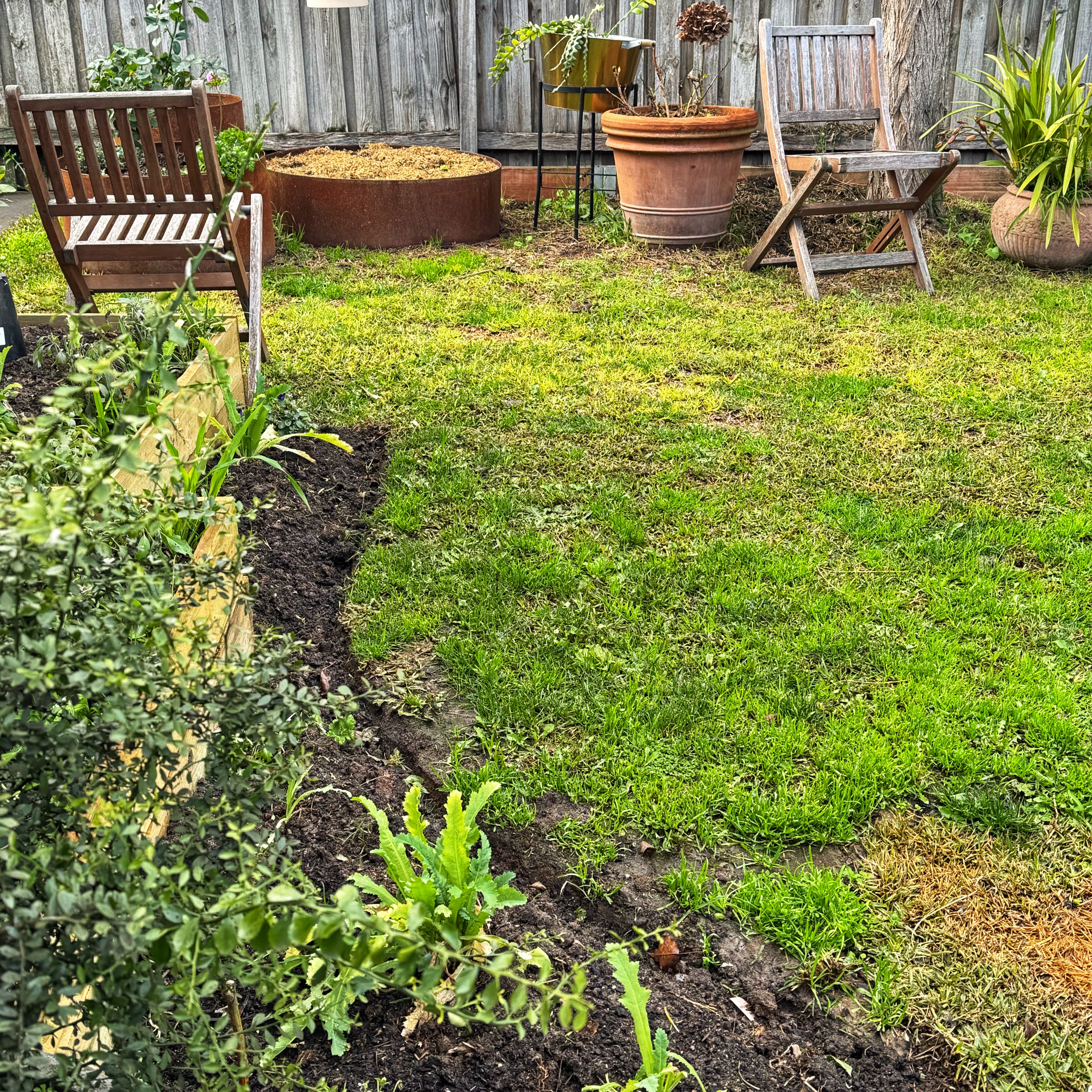 I enjoy digging and I have a habit of getting carried away and digging too much. This whole garden can be seen from the kitchen window. It is a tiny garden. It can be perfect. Every corner can grow something useful. And every corner is seen. I think all gardens are beautiful. And all gardeners are artists. But if I don’t get the curves right to balance the garden, they will annoy me when I look out the window. So I am taking it slow.
