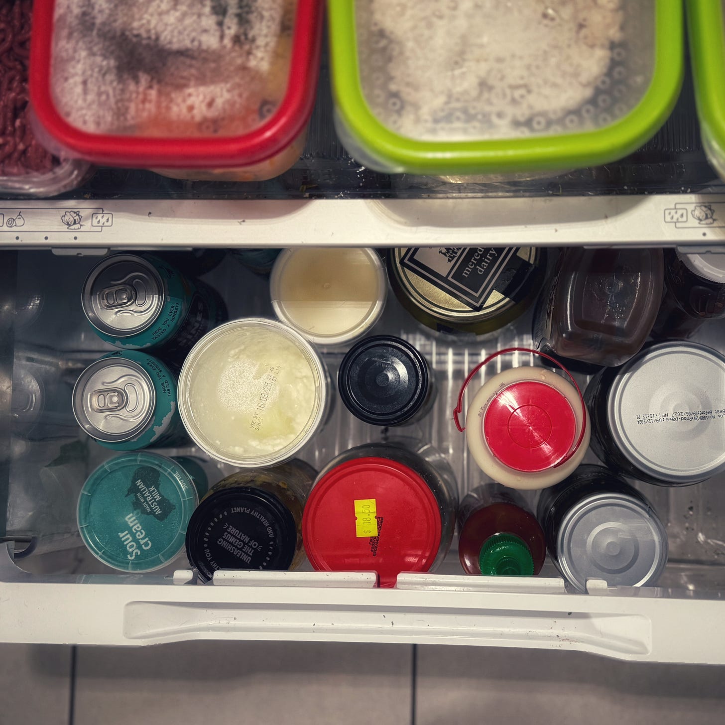 Condiments, back-ups and even dairy go into the bottom crisper drawer. Vegetables and perishables are on the middle shelf where I cannot ignore them.