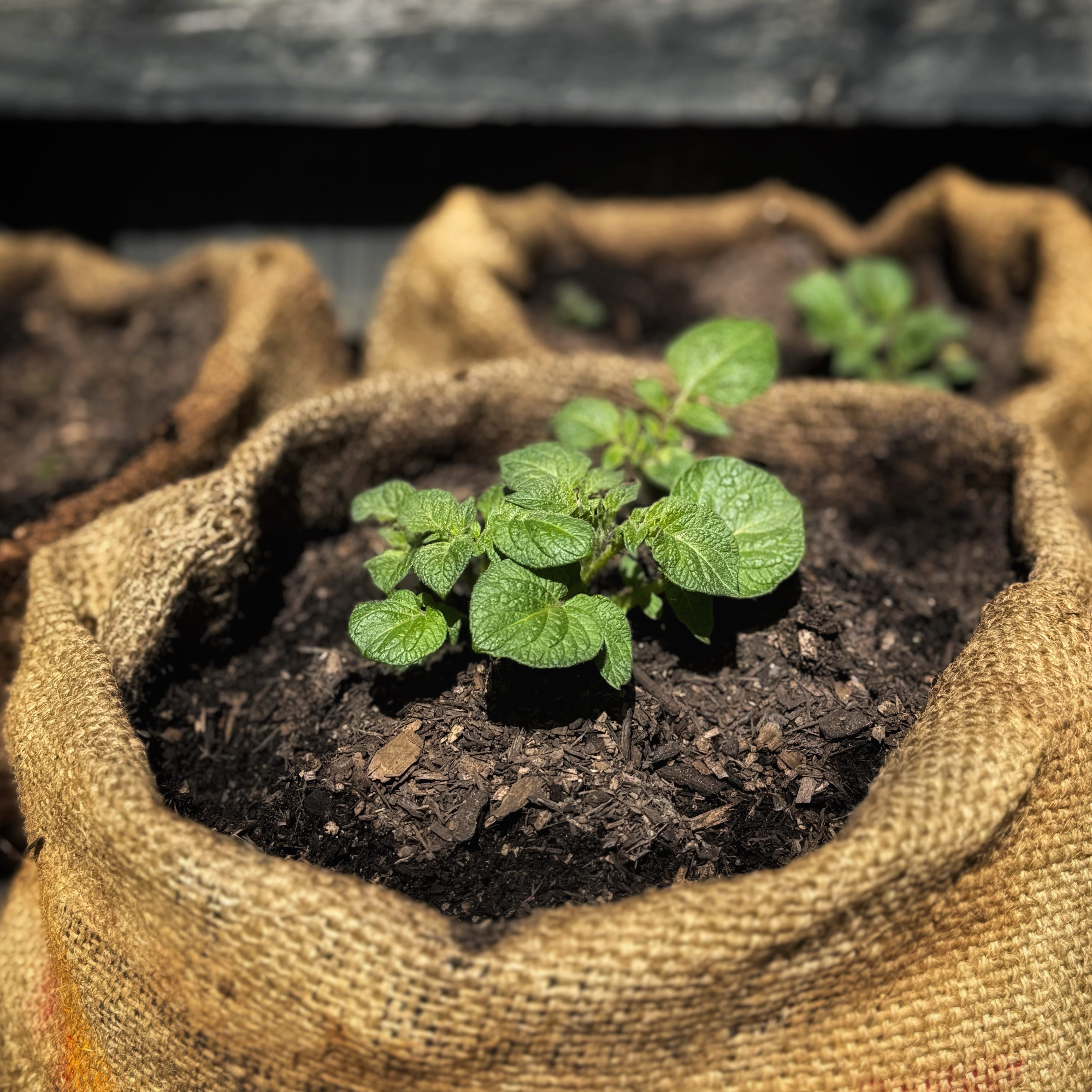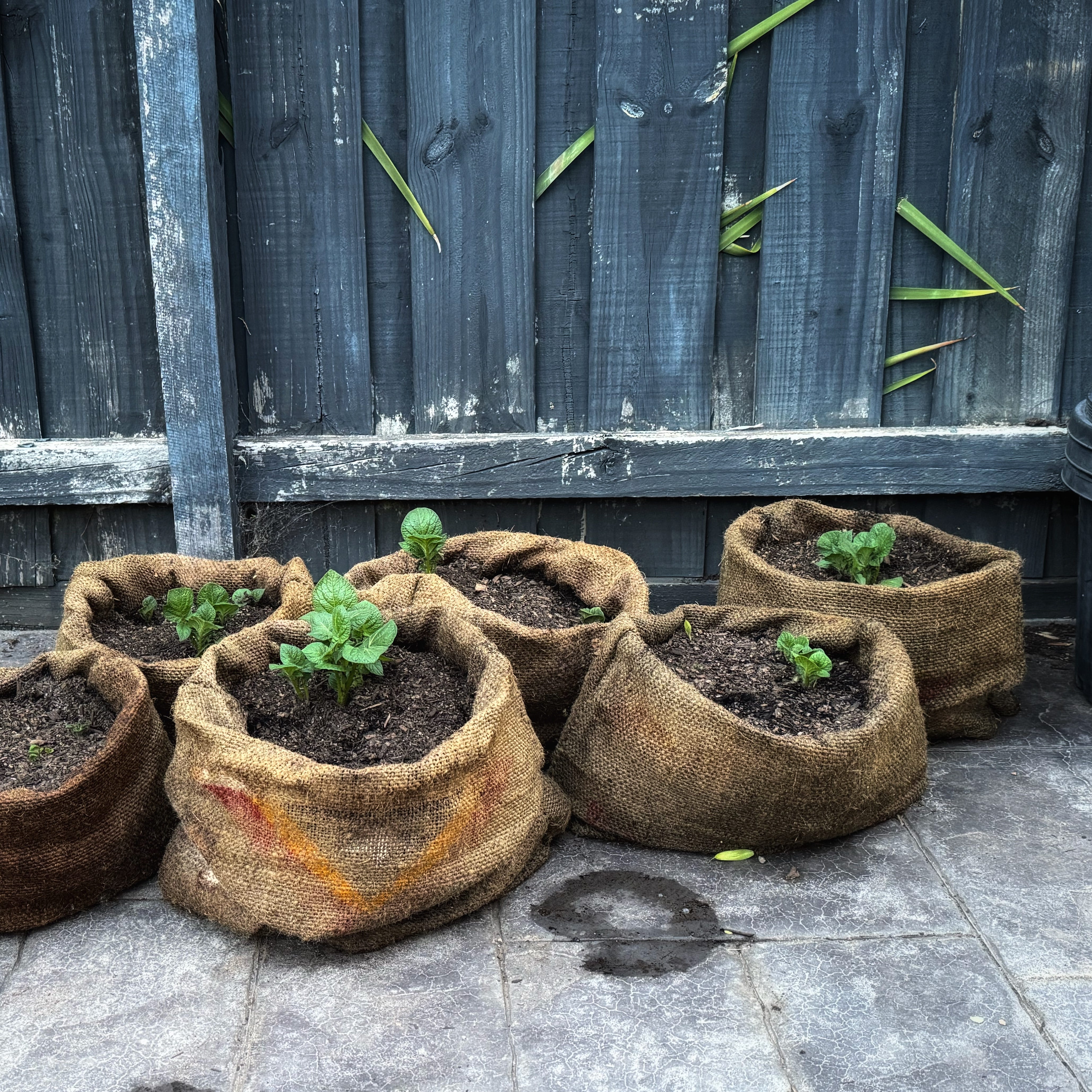 This summer in my Melbourne compact kitchens garden I have potatoes springing up in coffee sacks. And so far they are doing really well.