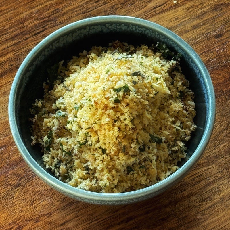 Two cups of pulverised breadcrumbs from quite stale bread plus 1/4 clove of garlic, (micro-planed on a zester — just a little, we don’t want the pangratatto too garlicky). Pick a small handful of mixed green herbs (we used sage and parsley), finely chop. Mix with a little good olive oil in a bowl, then roast on baking paper in the oven at 150°F for about twenty minutes. When cold use the paper to funnel the cooled crumbs into a container.