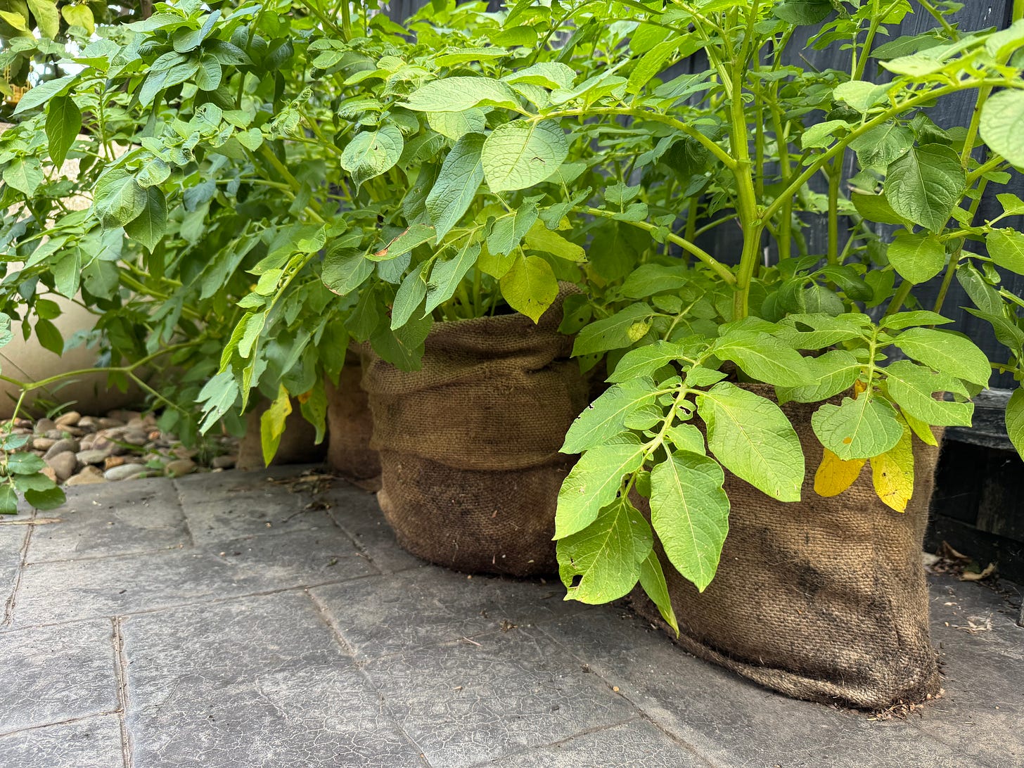 The potatoes are starting to look a little sad - which is a good thing - it means the potatoes are growing under there. Using up all the nutrients. We will break one of the bags open when the visitors arrive next week.