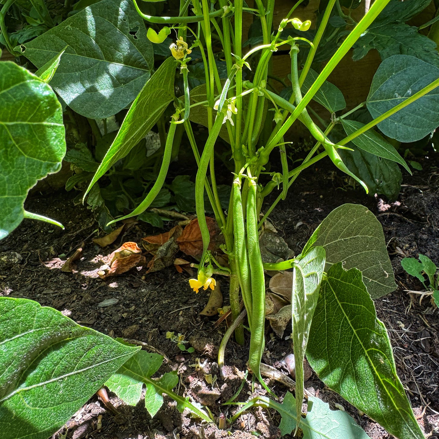 The beans are beginning to set. Growing at the base of the sunflowers and tomatoes. We will be eating a handful tonight. There are a lot more in the way.