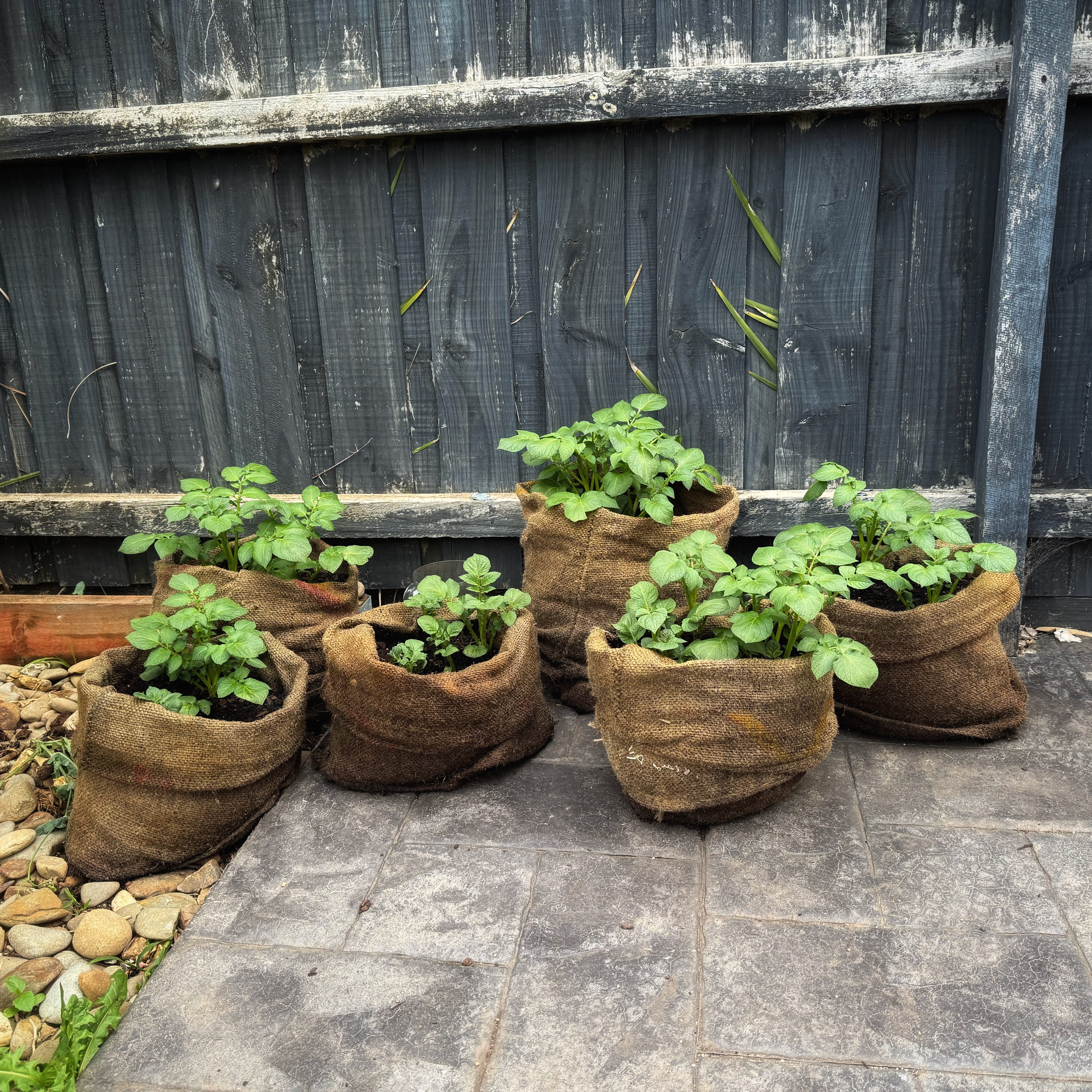 My Dad was always trying for potatoes and new peas for Christmas. We will certainly have the peas and the potatoes are growing nicely in their coffee sacks. Today I will tuck more potting mix around the stems of the potatoes. Soon I will switch to straw.