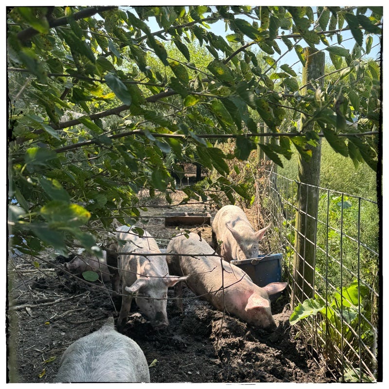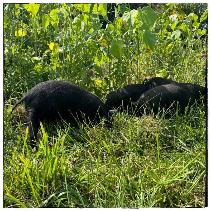 They have the whole field to roam now though the tiny pigs keep a weather eye on the gate just in case someone comes out of the kitchen with some food scraps.