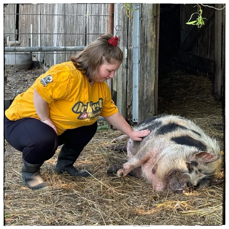 One of my farm workers with Tima. Tima is such a good pig. She is everybodies friend. She is more than happy to accept a belly rub!